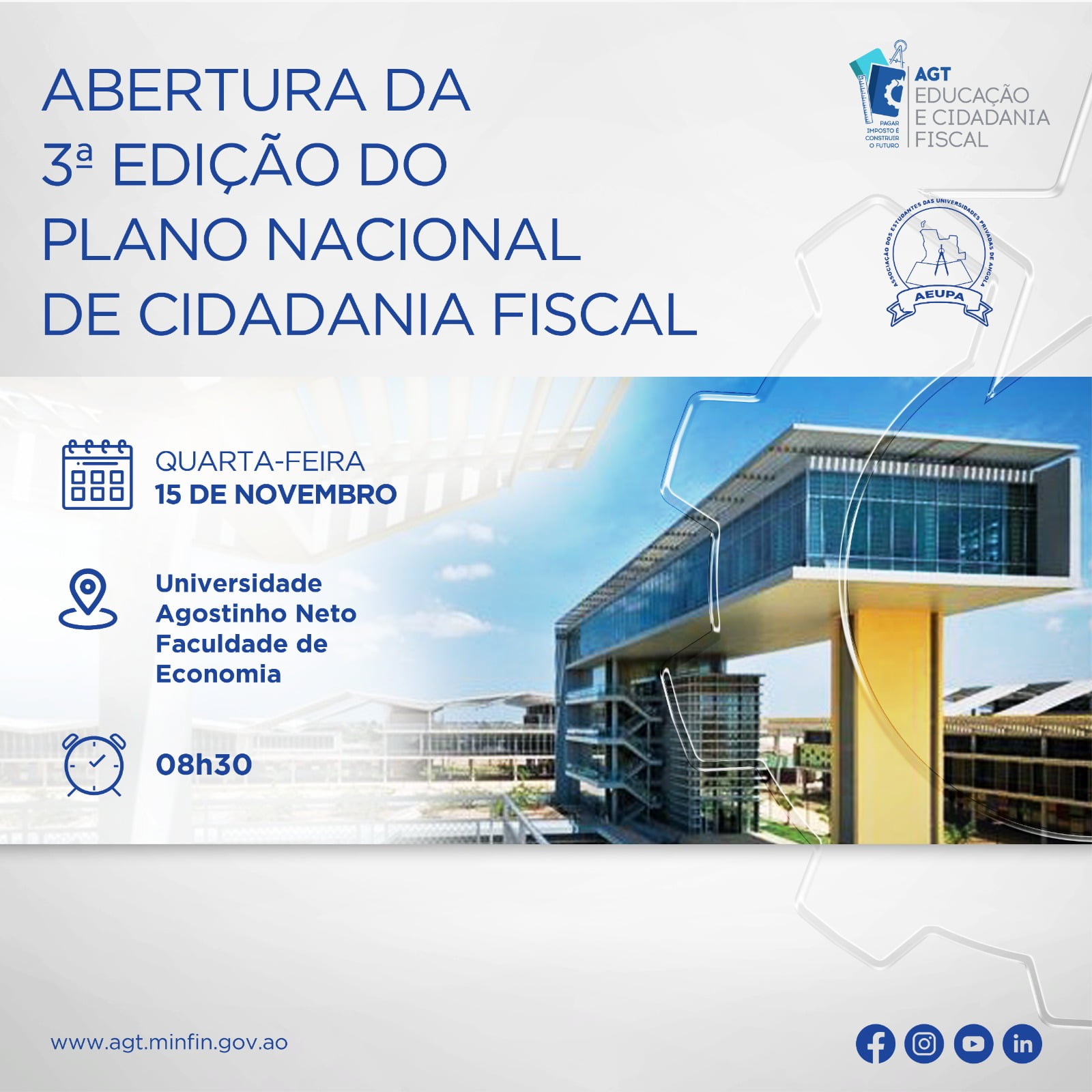 A Administração Geral Tributária (AGT) em Parceria com a Associação dos Estudantes das Universidades Privadas de Angola (AEUPA), no dia 15 de Novembro de 2023 no auditório da Faculdade de Economia da Universidade Agostinho Neto, as 8h30min, realizarão á abertura oficial da 3° Edição do Plano Educação e Cidadania Fiscal para estudantes universitários.