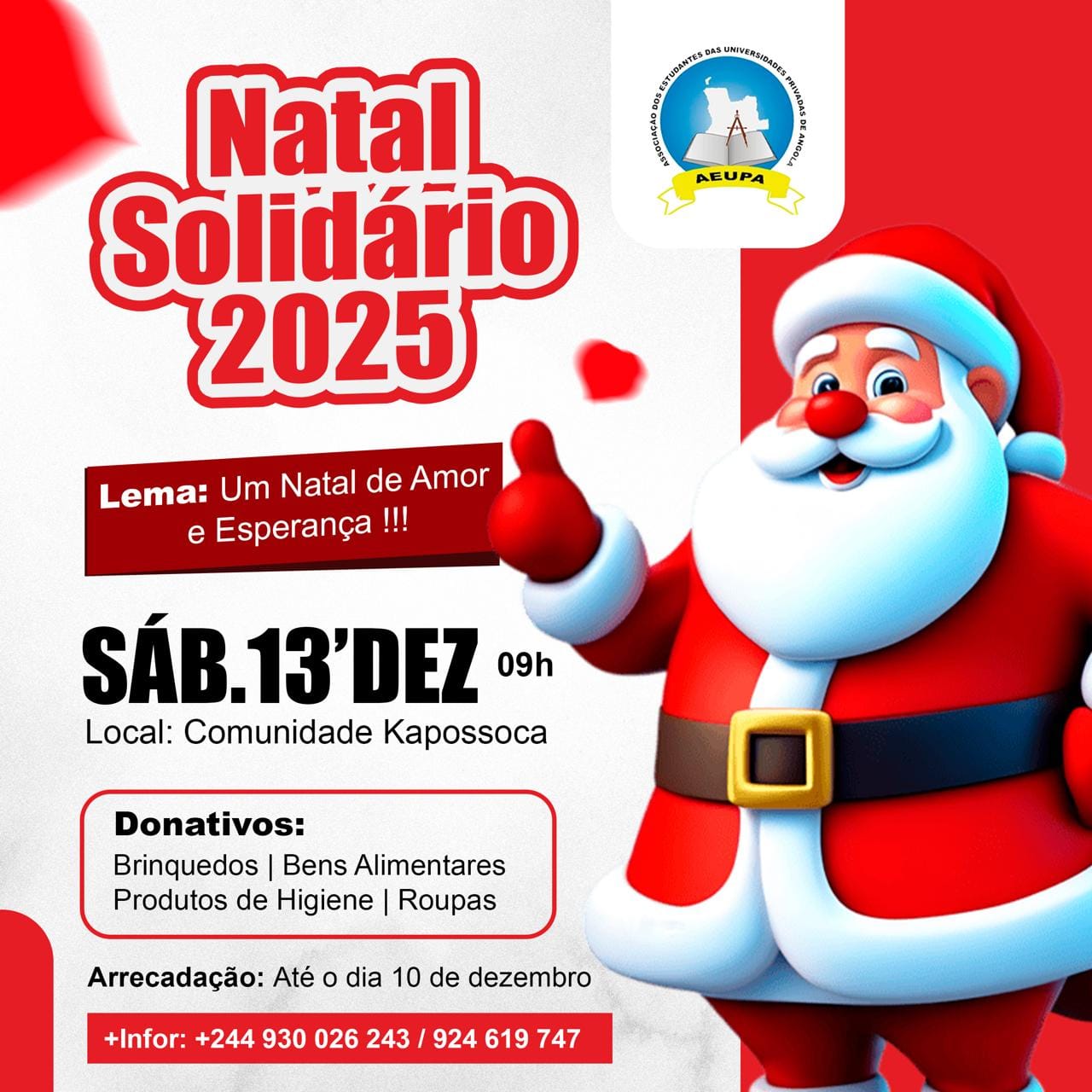 O Gabinete de Comunicação e Imagem da AEUPA informa à comunidade académica que, estará a realizar uma campanha de arrecadação de donativos em todas Universidades e Institutos Superiores do subsistema de ensino privado do País , no âmbito da realização do Natal Solidário edição 2025 .