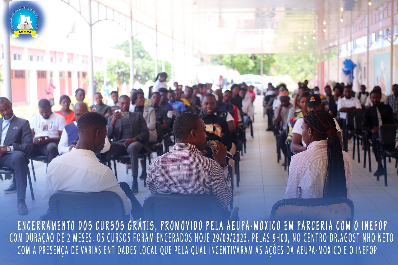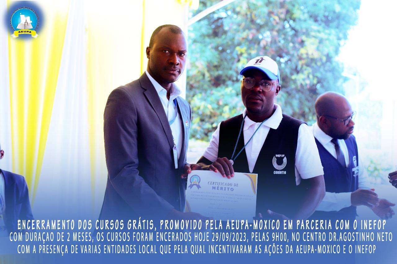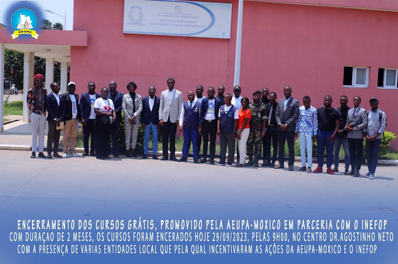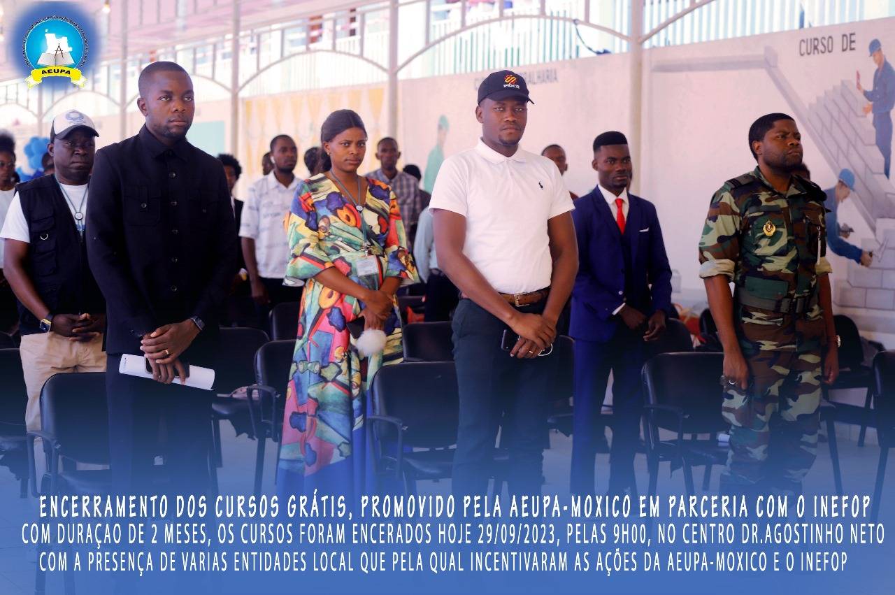 O excelentíssimo Director do INEFOP, Cahilo Guerra Mupila, acolheu assim os membros do Governo, representantes das instituições pública privadas, os formadores, formandos e os distintos convidados. E os mesmo cursos tiveram como duração 2 meses, como foco mostrar aos jovens como autosustentar-se se que possa depender muito de outrem. Aeupa-Moxico, tornar o Moxico uma praça acadêmica forte.